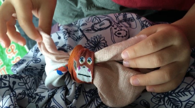 私自身も、【オランウータン】さんをバッグとして愛用しているのですが、ある日パパっと結んだふろしきの結び目にちょうど【オランウータン】さんの顔が出てきて、とても愛らしく思いました。