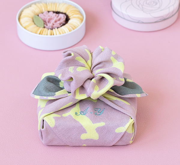 むす美では、可愛い花の輪のお菓子を更にふろしきでお花の形にラッピングさせていただきます。