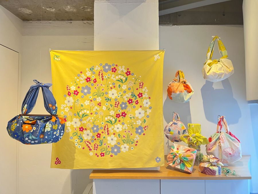 店内奥にはフランス人デザイナーAdeline Klamとむす美がコラボレーションした「ひめむすびシリーズ」を展開しております。日本の伝統文様とフランス独特の色彩が織りなすデザインは新年に向けた華やかな装いやお着物にもおすすめです。