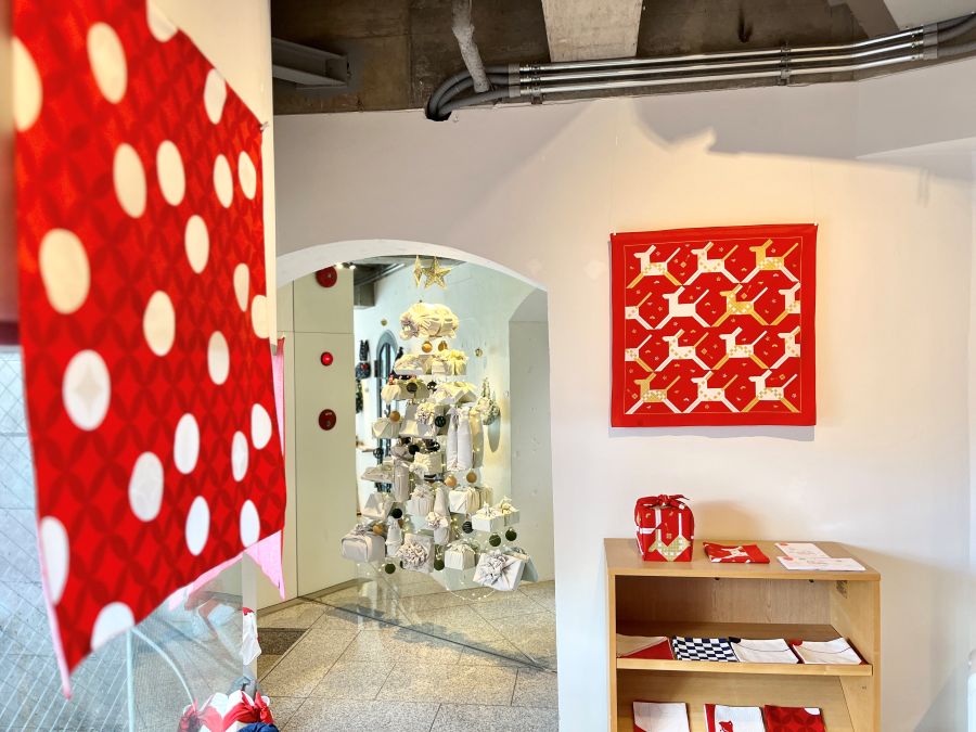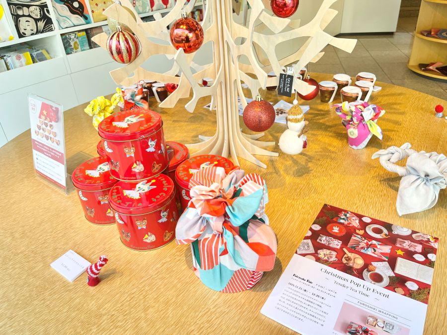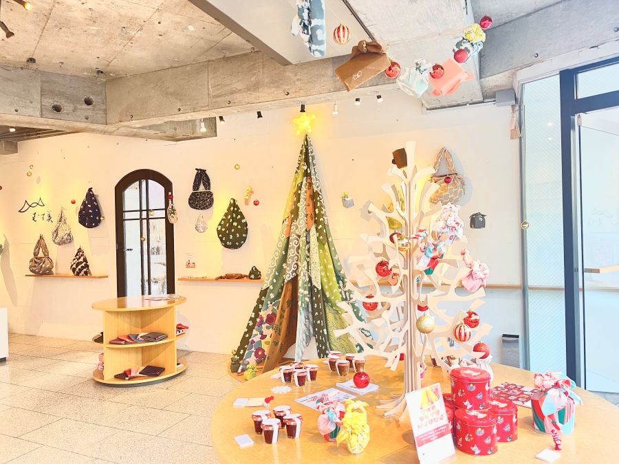 鏡前には白いラッピングツリー、レジ前と窓側にはクリスマスや年末年始におすすめのハレ包みシリーズをご紹介。クリスマスからお正月への移り変わりをご覧いただけます。
