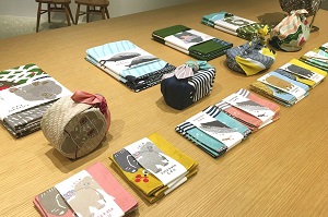 むす美京都をスタイリッシュな空間にしてくれているのは、KIGIさんとのコラボから誕生した「木々花々」シリーズです。風呂敷が"アート"にも見えるデザイン性あふれる一枚。今月のむす美京都店も、春のお洒落な空間に仕上がっていますよ☆
