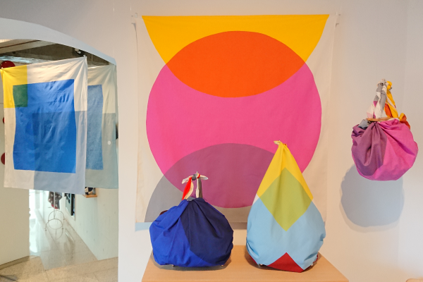 /* レジ周辺にはアール・ブリュットシリーズ、むす びが取り組むSDGsのひとつになります。障がい のある方たちによるアート作品を社会に発信し、 アーティストの支援、紹介を行う3団体とコラボ レーションし、色鮮やかでエネルギーあふれるふろ しきを生み出しました。 */ |