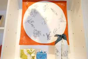 /* 店頭ウィンドウ前のテーブルには伊砂文様シリーズでふろしきのお部屋使いをご提案しています。クッションカバーやティッシュBOX包みがお部屋のアクセントになります。 */ |