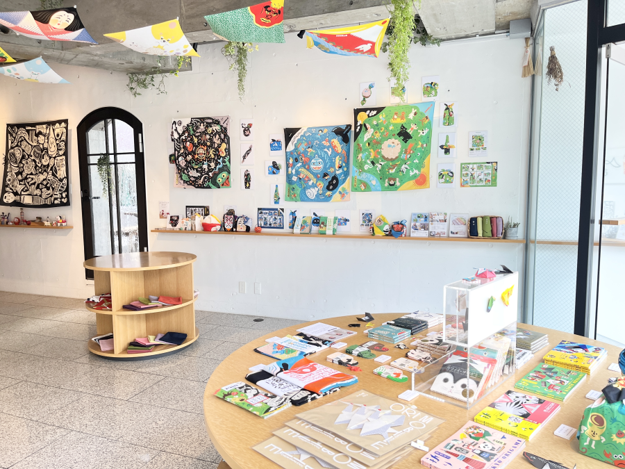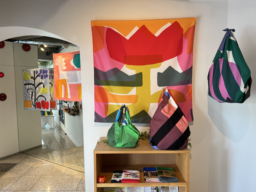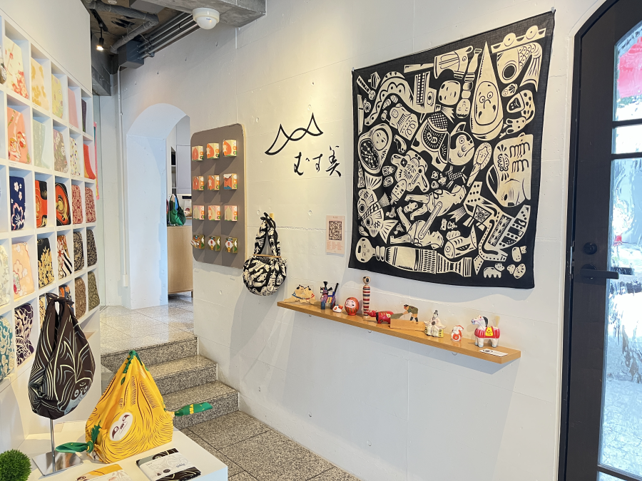 鏡前とレジ前にはテキスタイルデザイナー鈴木マサルとむす美のコラボレーションしたふろしきを展示。