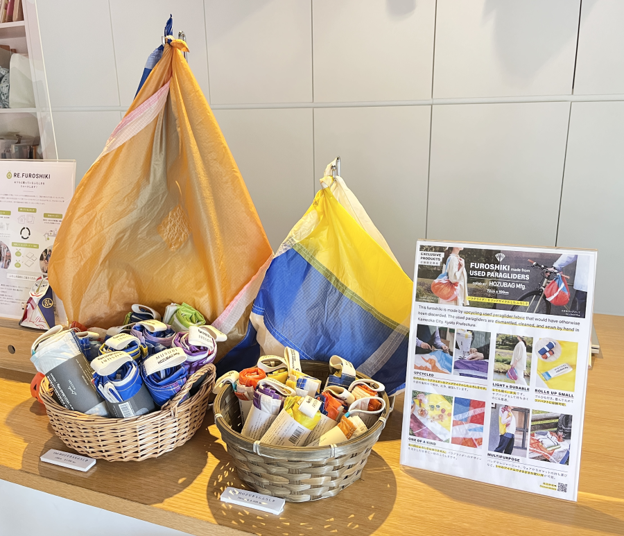 使用済みパラグライダーの生地で作られたアップサイクル商品のHOZUBAGを数量限定でレジカウンターにてご紹介中。