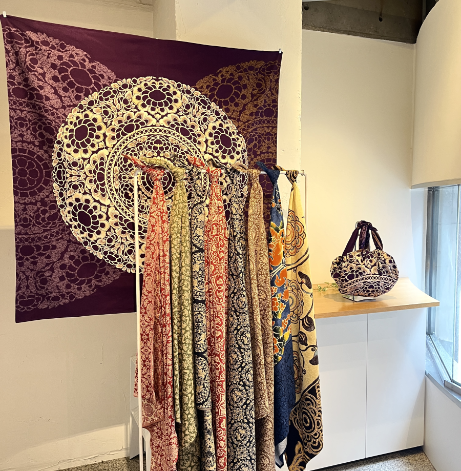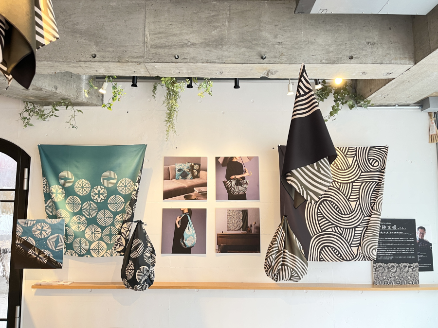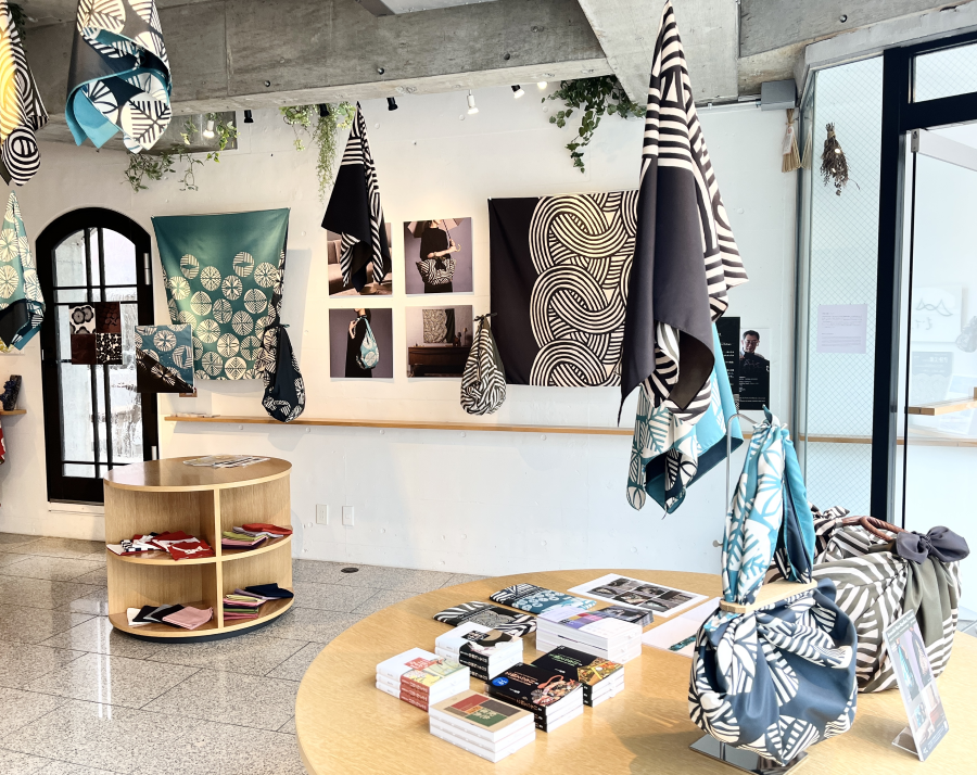 店内では、類まれな染職人の技術とむす美の挑戦の軌跡をご紹介しております。シックでシンプル、お洒落なディスプレイにもぜひご注目ください。