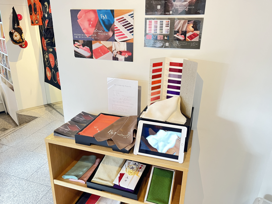 レジ前では、プレミアムオーダーフェアを開催中。真っ白な正絹生地から自分だけのふろしきを作ることができます。ご自身用や特別なギフト用にお好みの素材や色を選び、世界で1枚だけの特別なふろしきを誂えてみませんか。