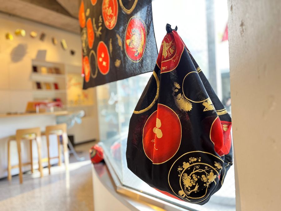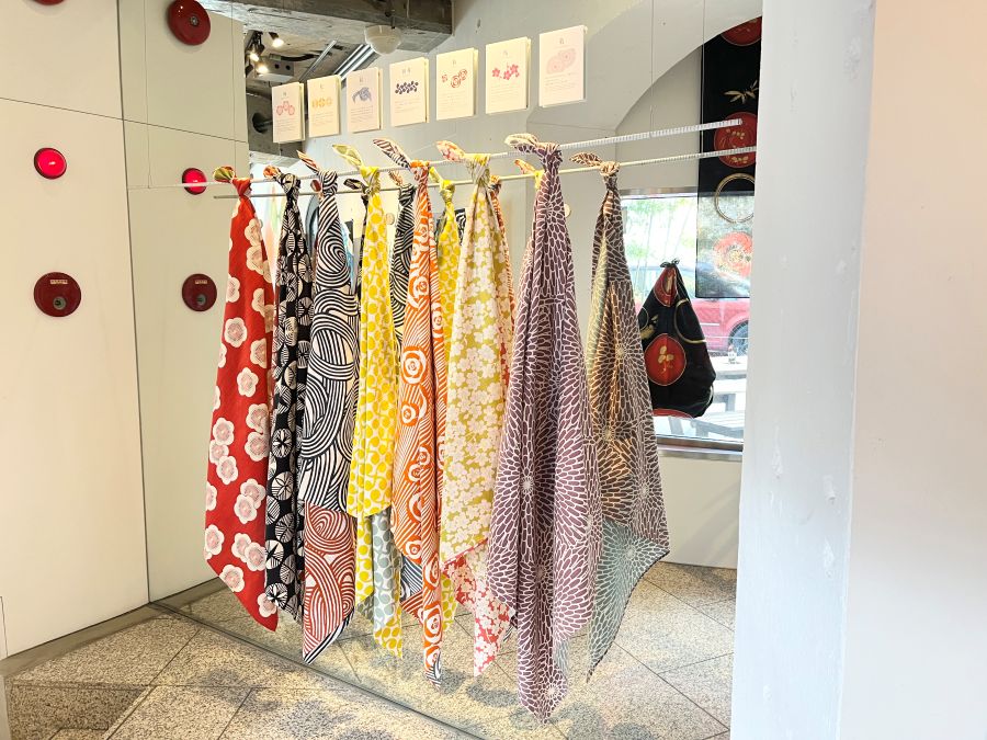 レジ前のウィンドウ周りには、日本の伝統工芸品をふろしきにデザインした「雪月花シリーズ」をご紹介。赤や黒などベースにしたシックな色味と日本のお椀や着物をモチーフにしたデザインで、海外の方にも好評です。Sサイズは通常のSサイズ(45㎝~50㎝)より少し大きめの58㎝となりますので、ヘアバンドやスカーフにも最適。Lサイズは120㎝と大判になり、バッグ以外にストールやテーブルクロスなどインテリアアイテムにもおすすめです。