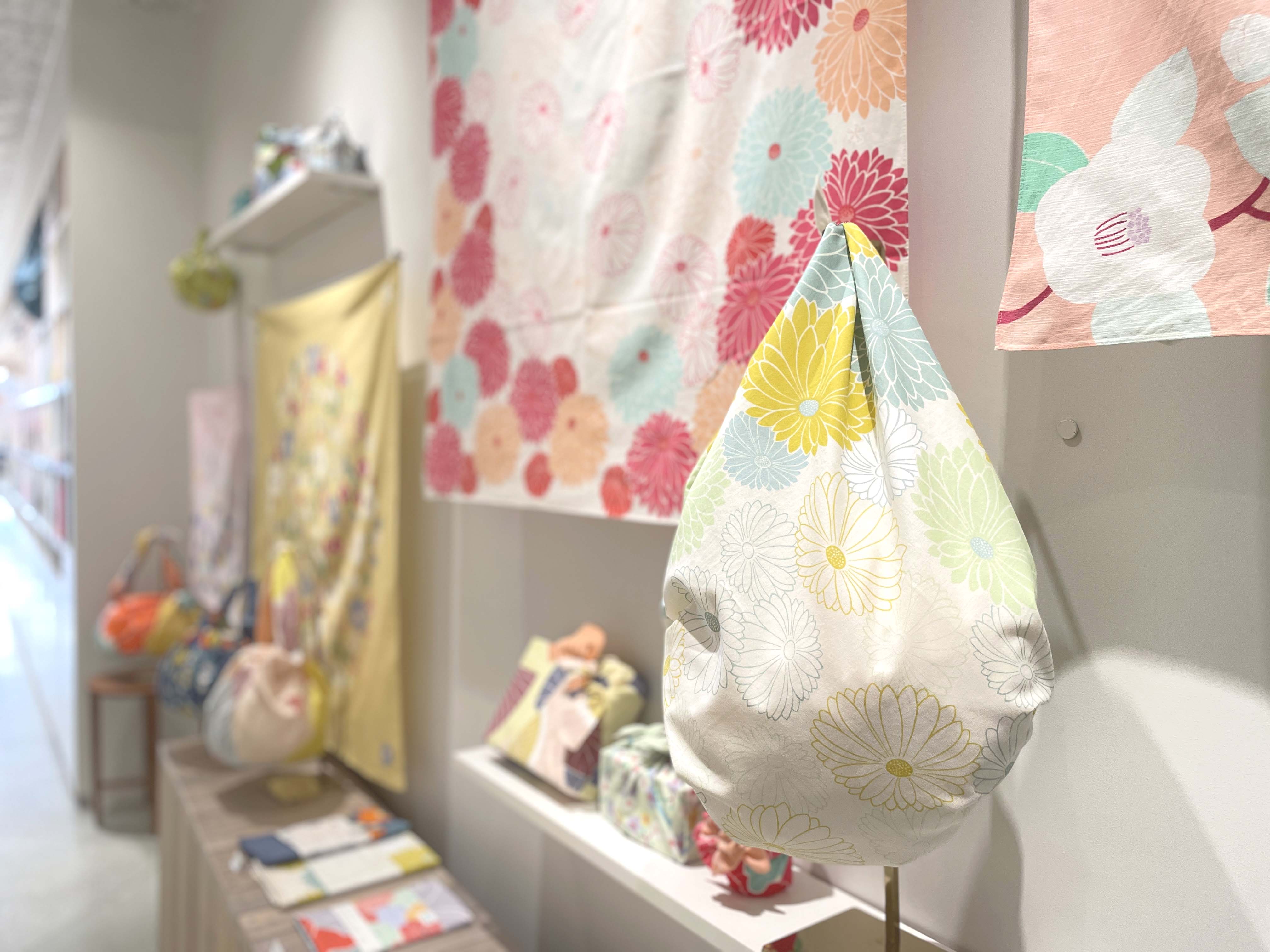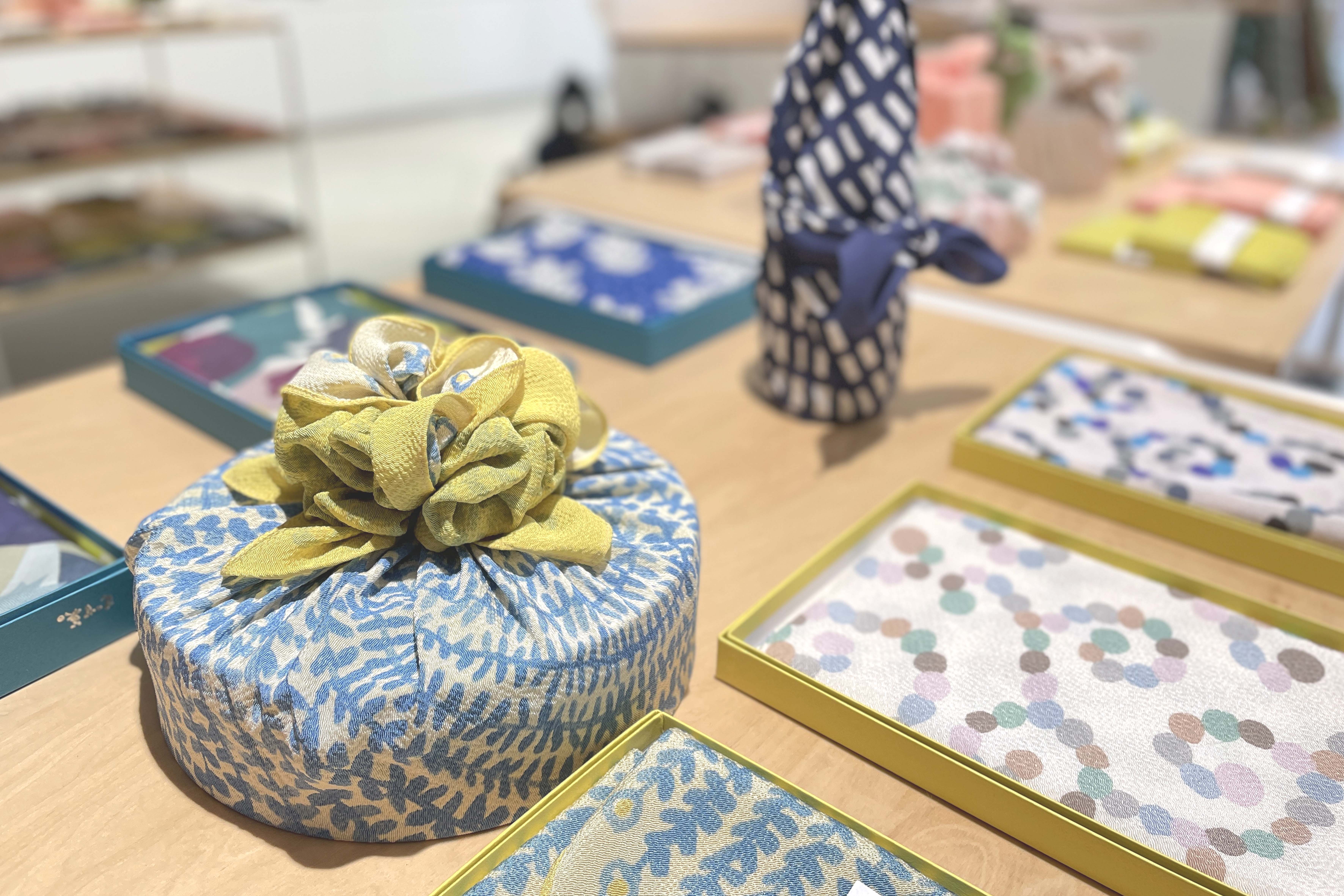 むす美ではPOP UP 商品とふろしきを一緒にご購入いただいた方にふろしきラッピングのサービスも承っております。