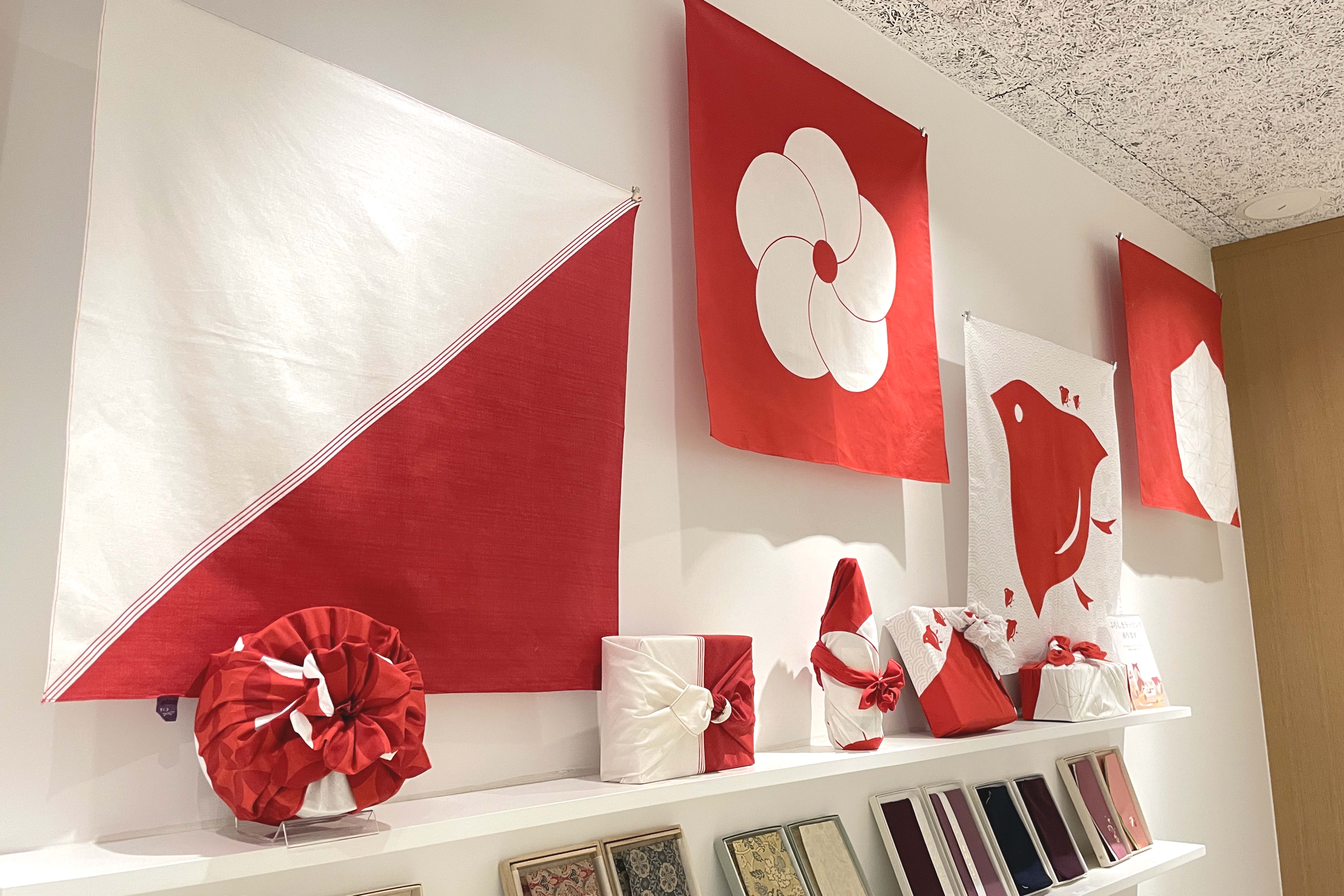 吉祥文様を大胆に構成し、紅白二色で染め上げたふろしきは、ハレの日にピッタリです。