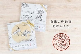 国宝「鳥獣人物戯画」は、擬人化された動物たちを描いた絵巻物で、平安・鎌倉時代の世相を反映しています。その自由で愉快な作風は、日本初の漫画とも称されており、現代の漫画やアニメーションの元祖とも言われています。中でも人気のある「猿追い」と「相撲」の遊び心ある2シーンがハンカチとなりました。